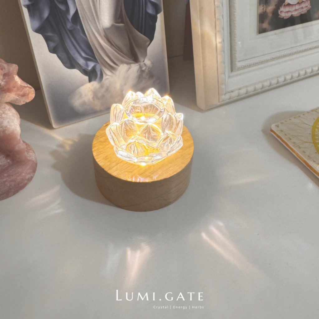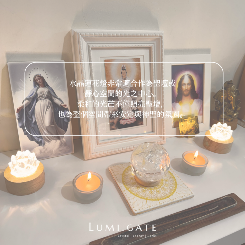 當你在聖壇上擺放神像、天使畫像、水晶或祈禱物時,點亮蓮花燈,就像點亮一朵象徵純淨與覺醒的光之蓮花。